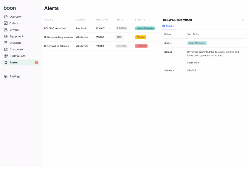 Connect Boon to your telematics provider and automatically remind your driver to submit BOL and POD when they get to the delivery location