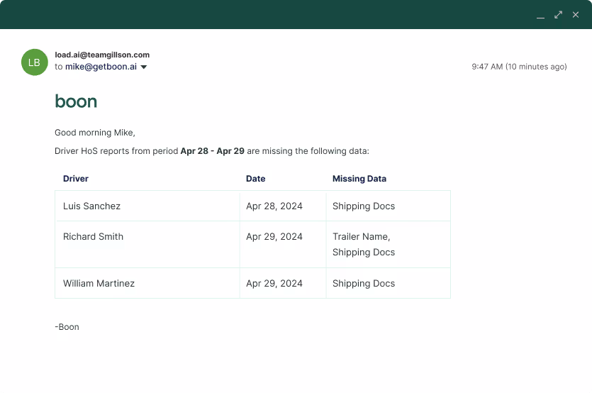 Boon identifies missing data in your drivers' logs and automates notifications to your compliance team and drivers to update drivers logs to reduce citations