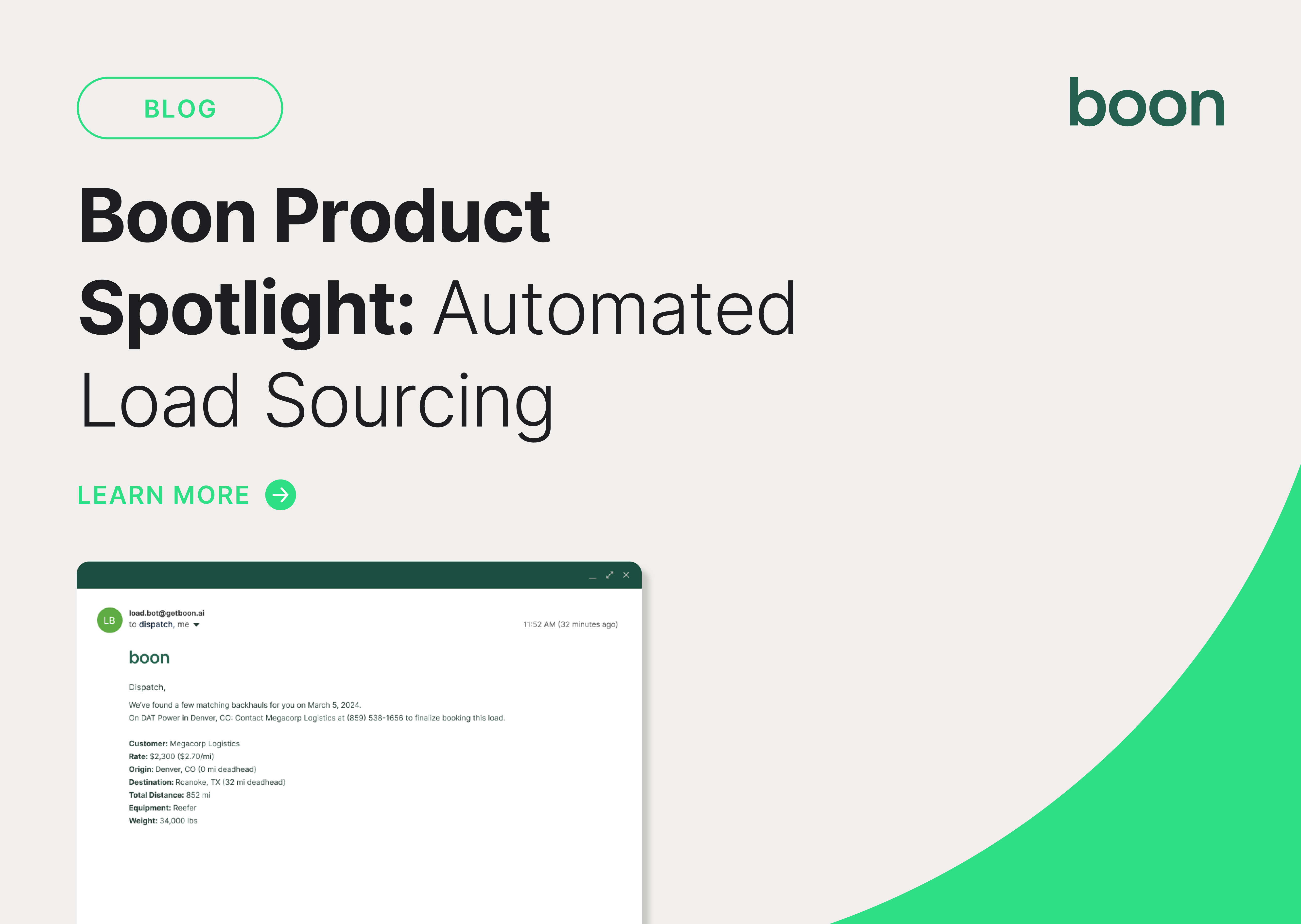 Boon’s Automated Load Sourcing product transforms backhaul management, helping fleets reduce empty miles, maximize revenue, and improve operational efficiency. With impactful results such as 50% fewer empty backhauls and six-figure revenue increases for clients like Sharp Transportation, Boon’s AI solution provides fleets with a competitive edge.