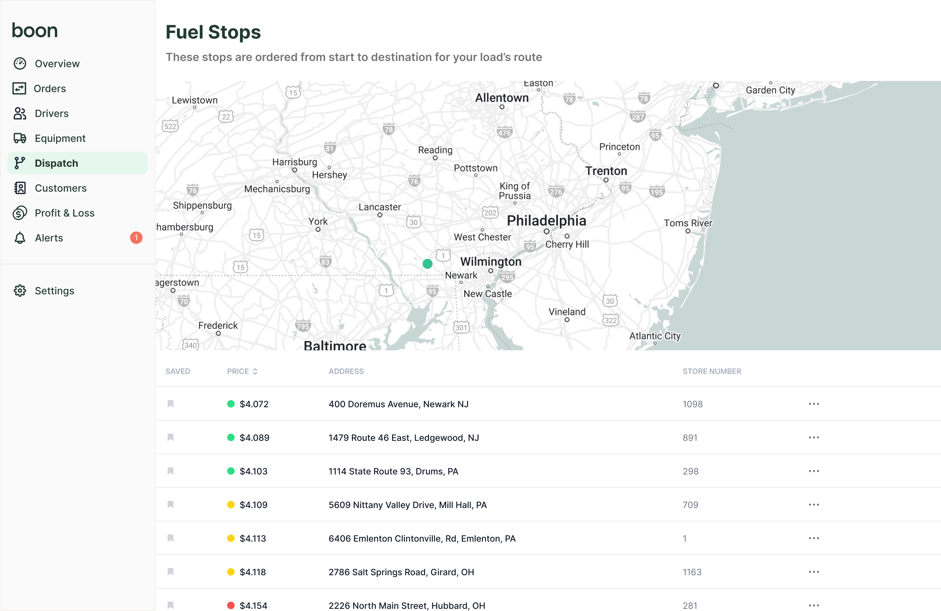 "With its Fuel Recommendations product, Boon helps us select the lowest cost in-network fuel stations on our drivers' routes. On average, we save about $7.40 per truck per day on fuel. Beyond optimizing for fuel expenditure, Boon's recommendations minimize driver choice and reduce back-and-forth communications with our drivers."