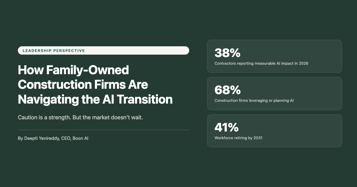 Deepti Yenireddy is the CEO and founder of Boon AI. She works with construction firms of all sizes, including many family-owned businesses navigating their first steps with AI.