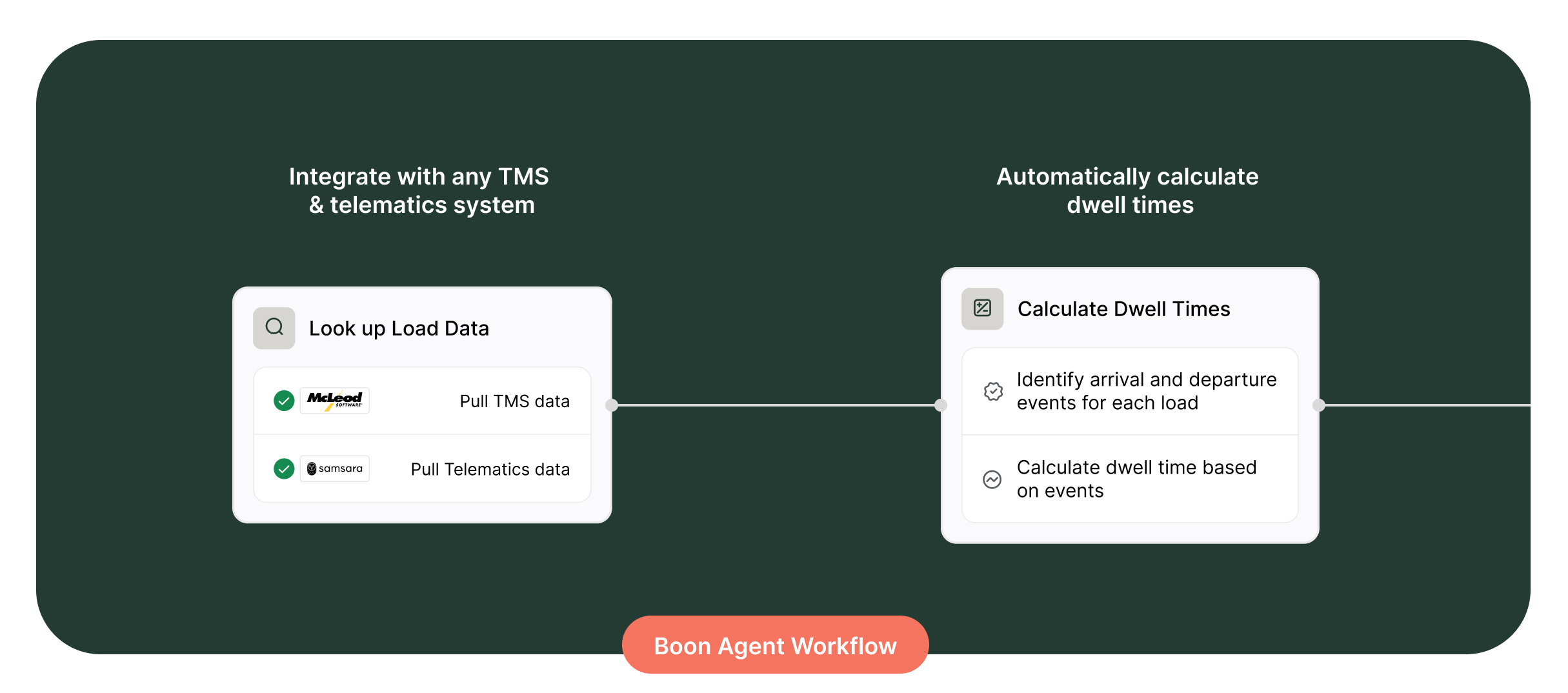 Boon connects directly to your TMS and telematics systems to pull load data and automatically capture arrival and departure events. It calculates dwell times behind the scenes, giving your team real-time visibility without relying on driver updates or manual tracking.