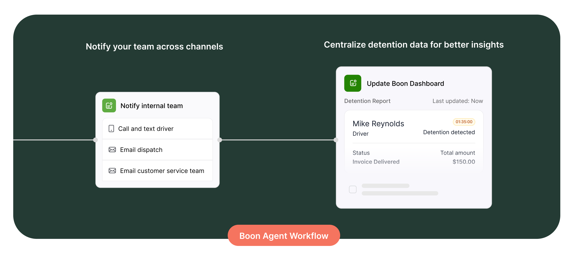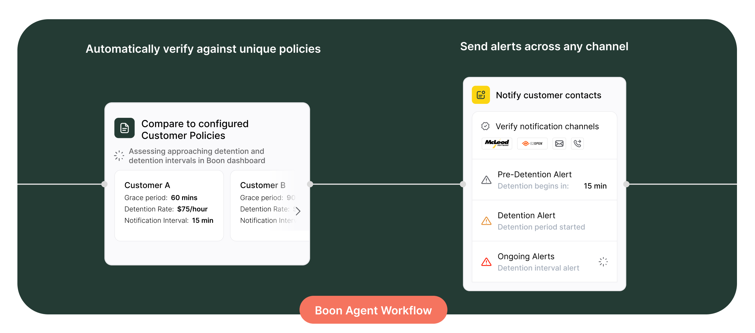 Unlike basic timestamp trackers, Boon's Detention Tracking Agent mirrors how your best dispatchers operate: