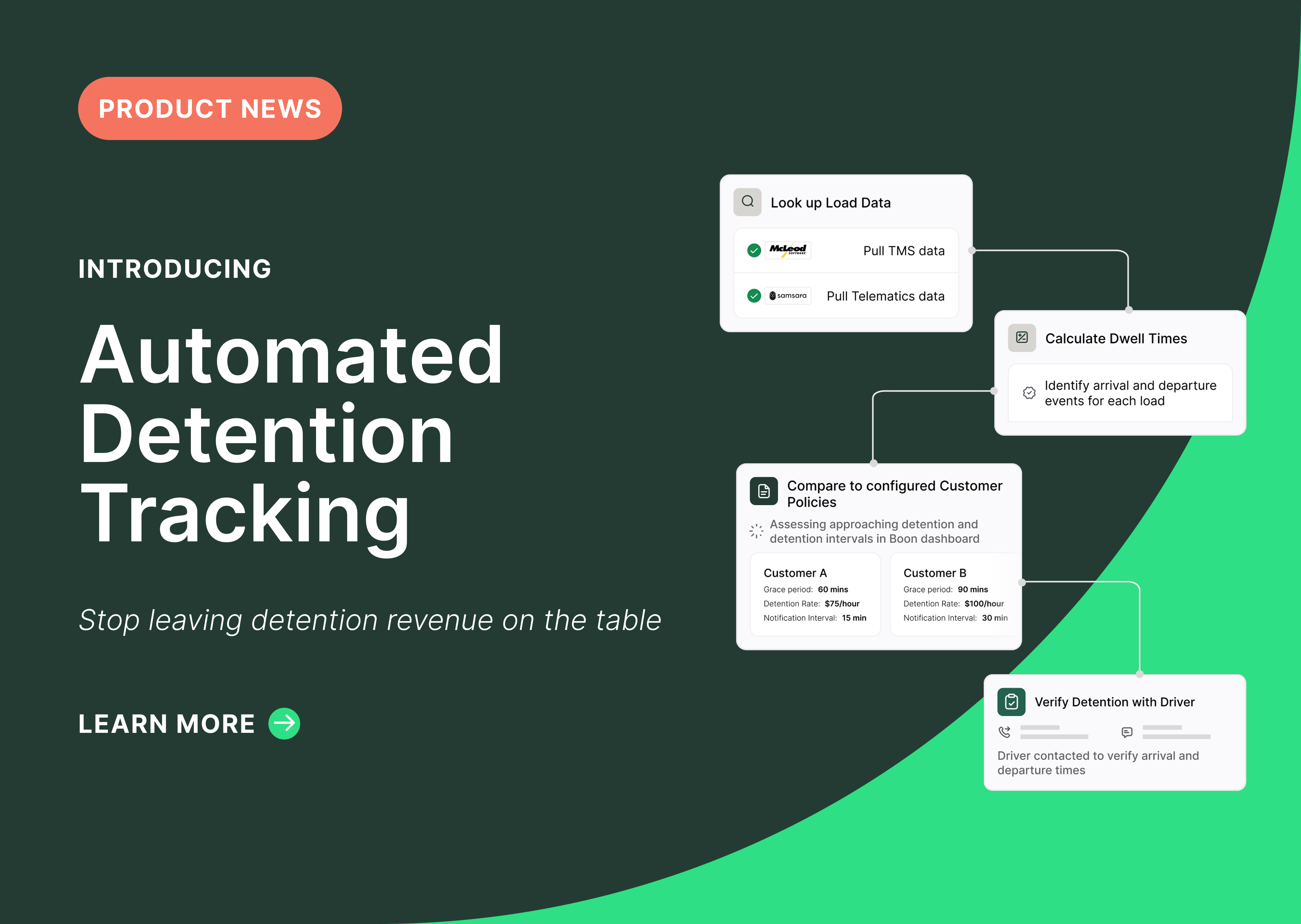 Detention Tracking is the latest addition to Boon's platform, giving fleets a powerful new way to automate detention monitoring, customer communication, and revenue recovery, all in real time.