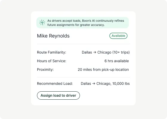 Dispatch Assistant recommends loads to drivers based on driver characteristics like route and cargo familiarity, Hours of Service, proximity and more. Recommendations train Boon’s AI agents to self-recommend drivers to loads over time