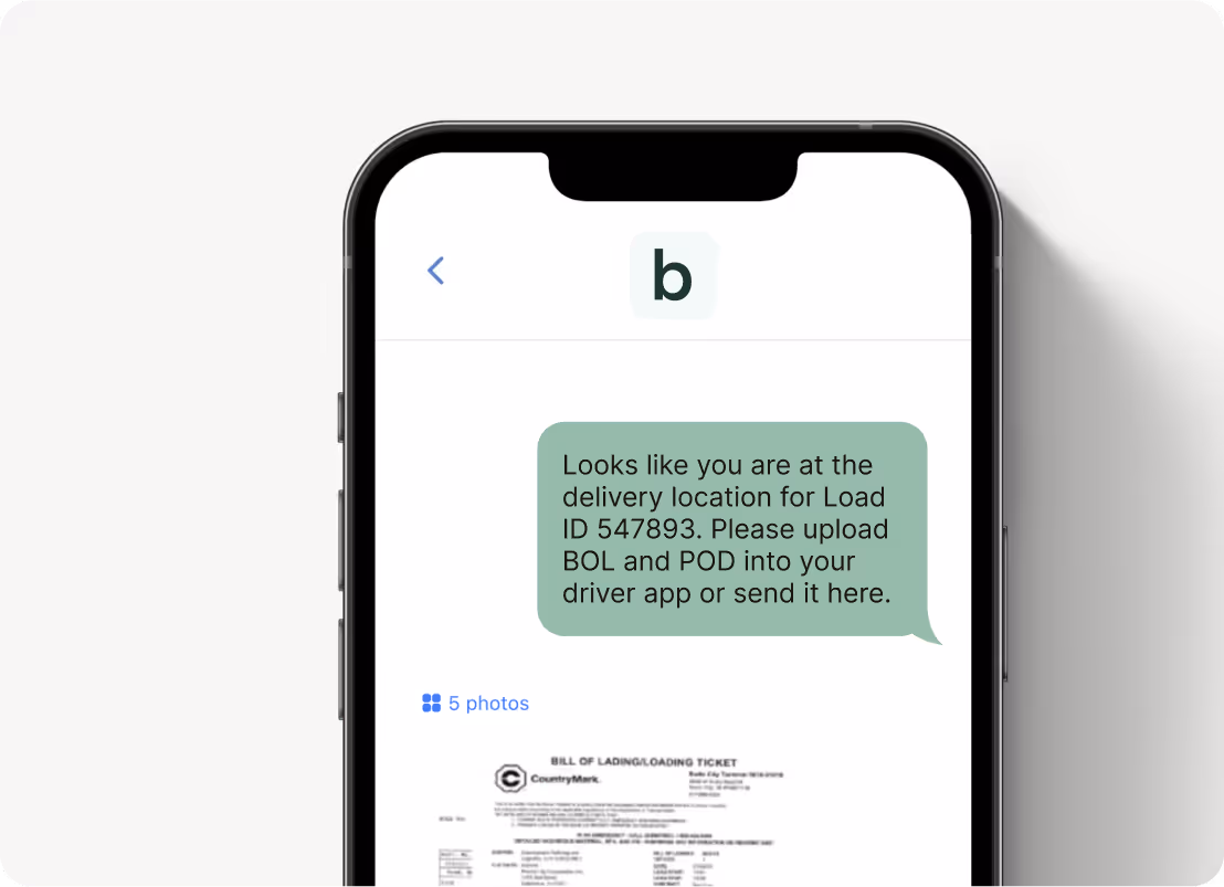 Connect Boon to your telematics provider and automatically remind your driver to submit BOL and POD when they get to the delivery location