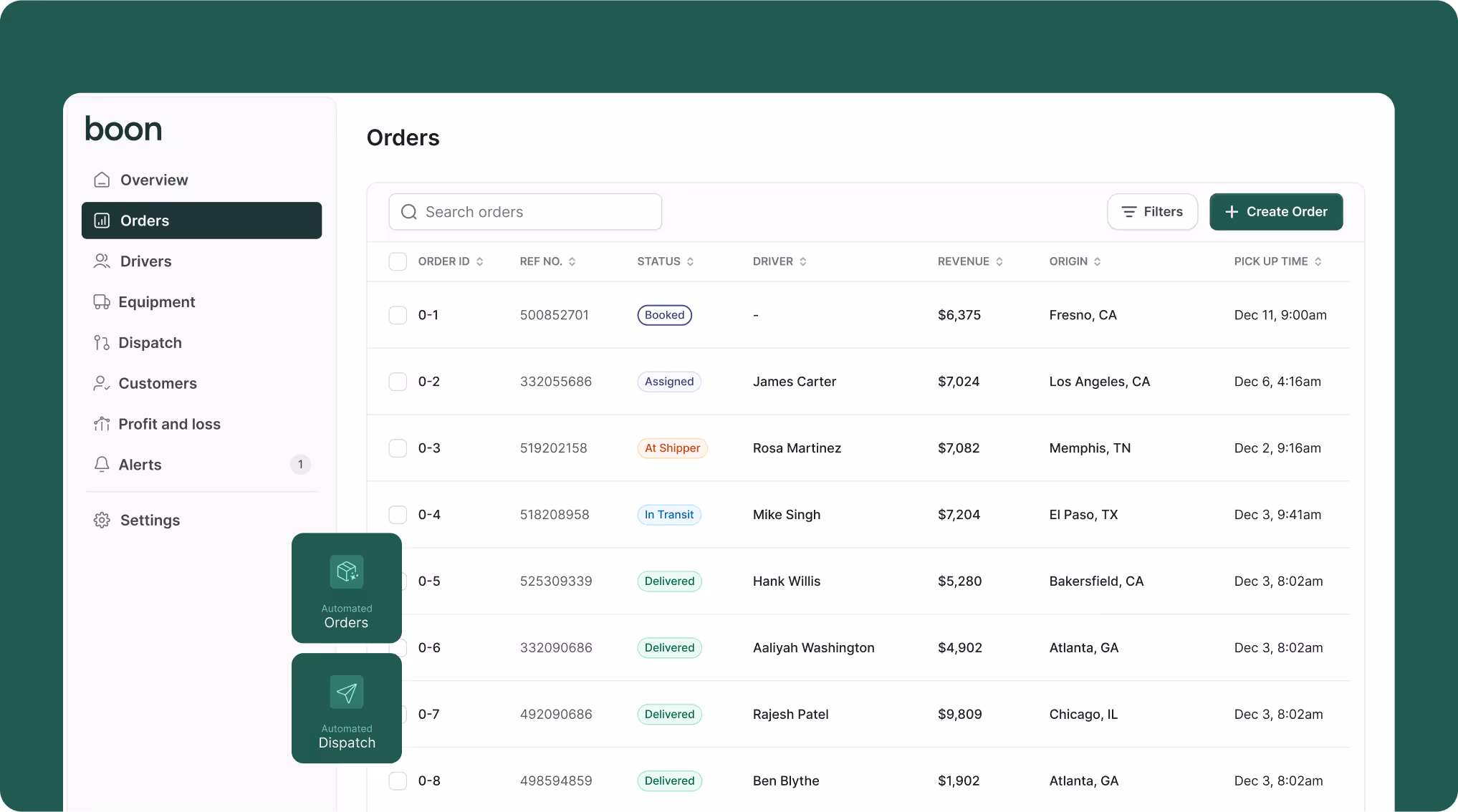 The automated order entry is one of my favorite features because it alleviates several hours worth of work. Instead of taking a rate confirmation and manually punching it in - it automatically gets forwarded to Boon and inputted into our TMS in mere moments. We can reduce the hours of manual typing something in and taking it down to just mere minutes to get entered in.