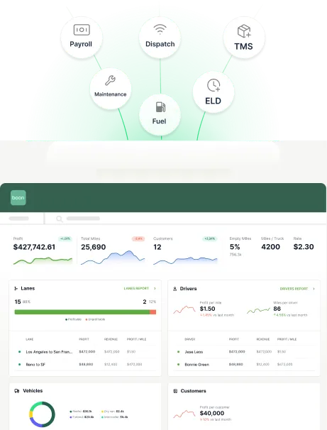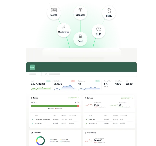 Surface fuel, payroll, and maintenance expenses in one dashboard to eliminate blindspots and act early. Boon integrates with all of your existing systems including accounting, TMS, telematics, payroll, and more.
