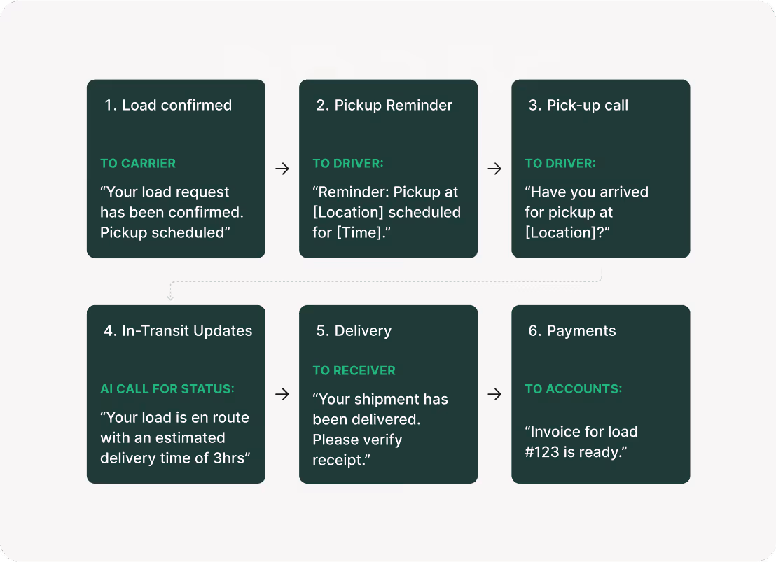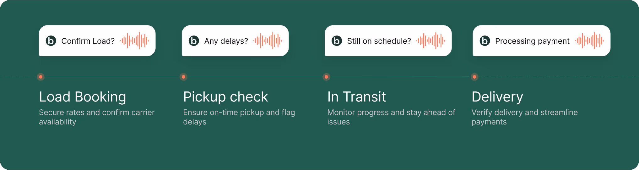 Where best in class intelligent voice solutions revolutionize the way you work as a fleet, broker or a shipper. Experience the power of real-time communication, streamlined processes, and enhanced productivity, all powered by cutting-edge AI.